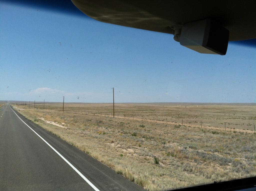 Monday we headed home by an eastern route, through Carlsbad and Roswell in NM (rather than the I-25/I-10 route through El Paso we came down by). A couple of years ago we drove the "loneliest road in the US," US 50 across Nevada, but I think the 95 miles from Roswell to Vaughn has to be the most desolate. In Nevada you're traversing range-and-basin country, so your view changes. Not so here.